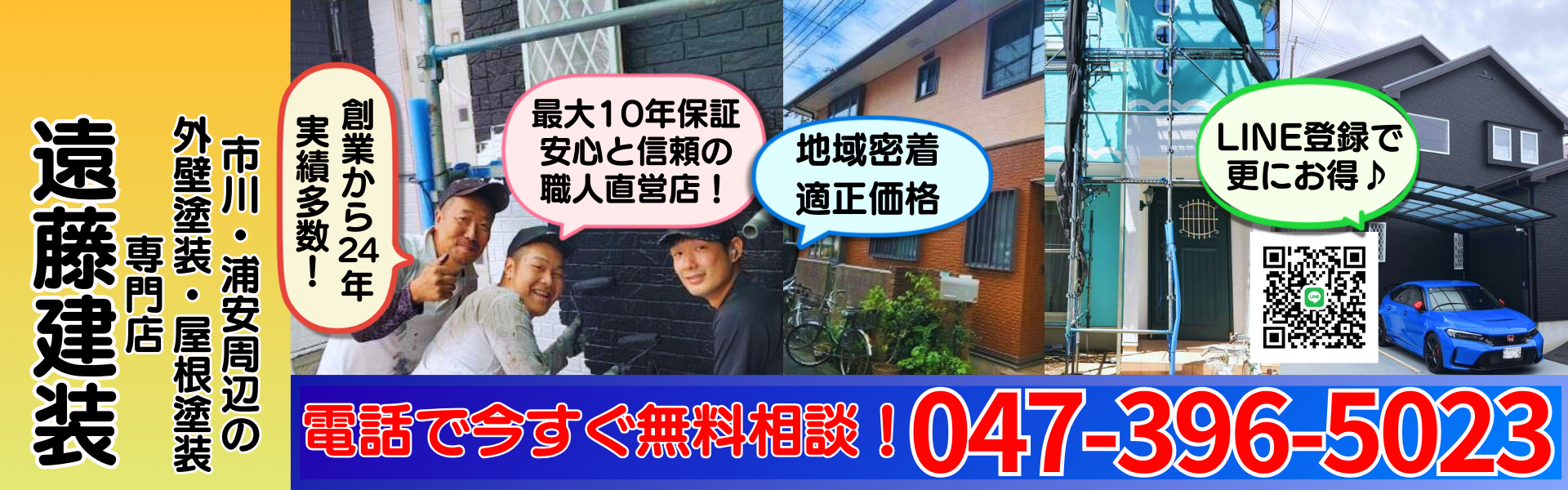 千葉県市川市や浦安市に対応する遠藤建装は、外壁塗装を中心に多くのお客様にお喜びの声をいただいております!工事前には近隣住民への挨拶やスケジュール連絡を徹底し、騒音や異臭にも配慮。戸建て・マンションだけでなく、店舗からの依頼にも対応可能です。