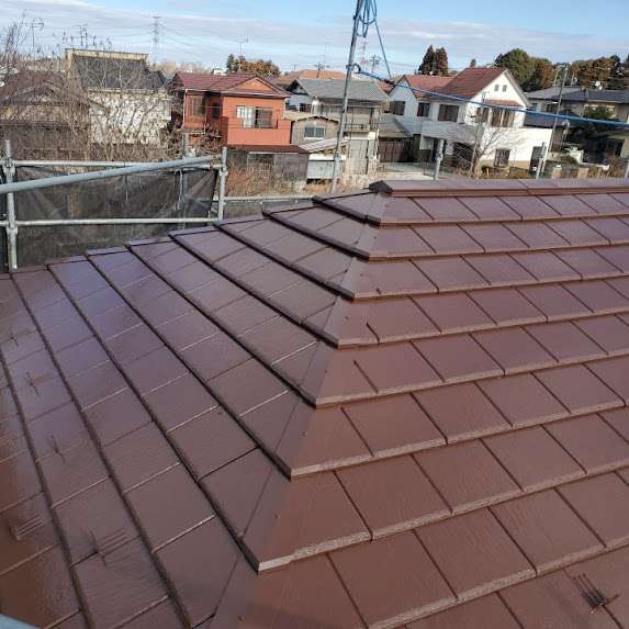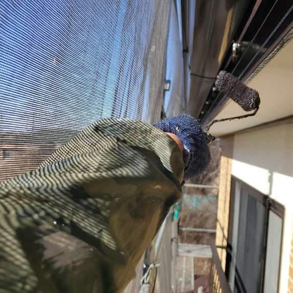 屋根(セメント瓦)は、細部を電動ガンで吹き付け、平場は20mmマイクロローラーを使用して三回塗り。膜厚を確保し、耐久性とツヤ感を重視した仕上がりに✨
