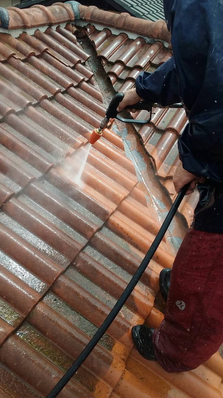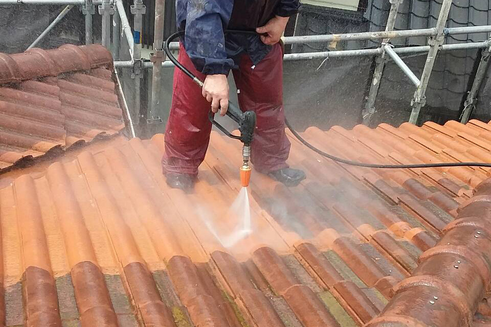 洗浄作業中をご覧ください。屋根を洗浄している状況はなかなか見れませんよね